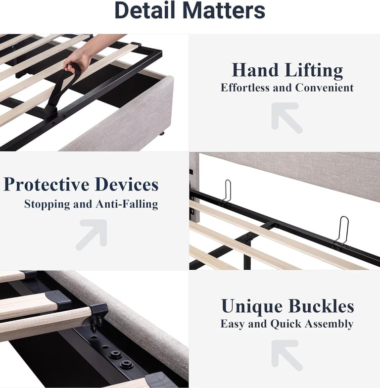 Additionally, the hydraulic lift system is designed for smooth and reliable operation. You can trust that the bed will stay securely lifted when accessing the storage area, and it will lower gently when you're ready to sleep.
